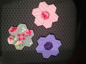 Yesterday I was able to work on some hexies. Before leaving on this trip, I wanted to do a hand stitching project and came across a package of hexagon paper pieces. I have seen the hexie world out in blog land for quite some time, so since I already had the paper pieces already cut out and ready to go, I just rummaged through some scraps that I thought would make some really nice flowers. Reasoning behind this is because I think I will be making a small quilt using the Grandma's Garden pattern. Google it and you can see what the Grandma's Garden looks like if interested.