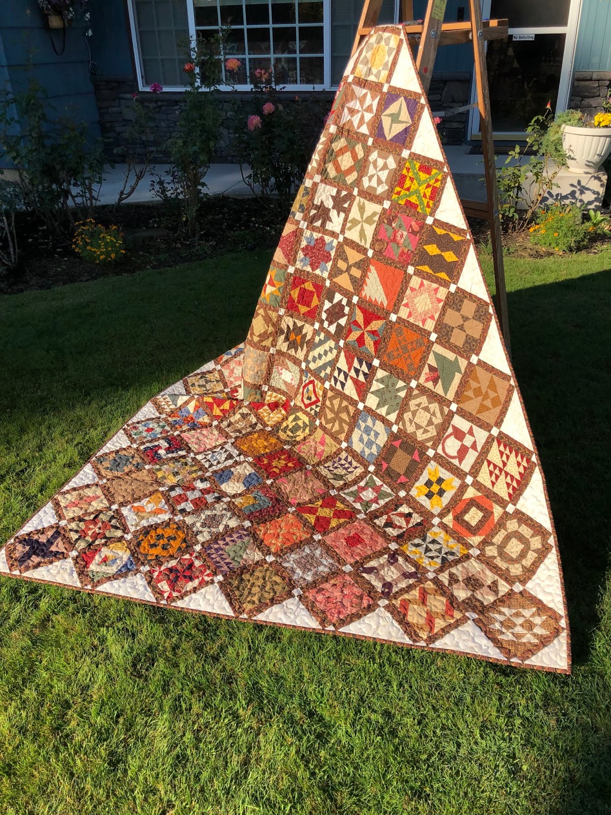 I tried to get a picture of all the blocks used in the sampler. Just a note about the blocks done in this sampler. Remember they are only 6.5" square, and some of them had up to 65 pieces per block. Sometimes it would take about 2 to 3 hours per block to make.